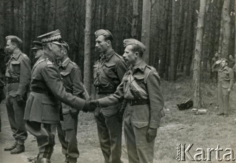 Generał Władysław Sikorski wita się z oficerami (major Rawicz-Sczerbo, capt. Bloomgield, por. Sidorowicz, por. Drelinkiewicz). W głębi, w lesie asp. Janota.