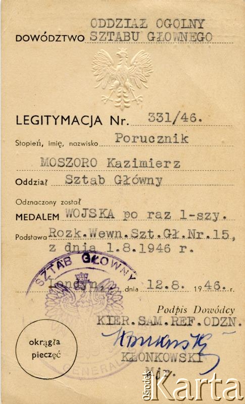 Legitymacja poświadczająca odznaczenie Kazimierza Wiktora Moszoro Medalem Wojska (po raz pierwszy). W 1942 roku Kazimierz Wiktor Moszoro został skierowany do Londynu do odbudowy Wojskowego Instytutu Technicznego.